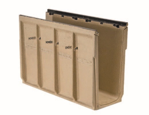 Polymerbetonové žlaby s integrovanou zesílenou ochrannou litinovou hranou a těsnící drážkou dle ČSN EN 1433