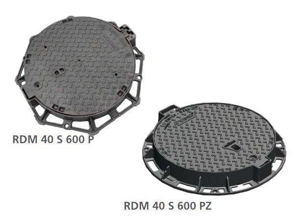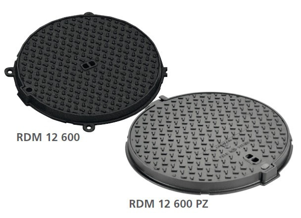 Kruhové litinové poklopy a mříže s rámem, pro chodníky a komunikace s vysokou zátěží. Zatížení A15 - F900 kN.