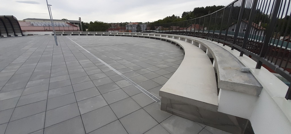 Nerezový odvodňovací žlab vnější šířky 100 mm, výškově nastavitelný nebo s pevnou stavební výškou, určený pro odvodnění fasád a teras. Při umístění u fasády urychluje vysoušení fasády po dešti nebo od sněhu. Usnadňuje bezbariérové řešení podle norem.