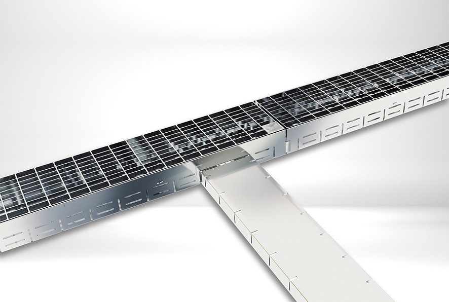 Nerezový odvodňovací žlab vnější šířky 250 mm, výškově nastavitelný nebo s pevnou stavební výškou, určený pro odvodnění fasád a teras. Při umístění u fasády urychluje vysoušení fasády po dešti nebo od sněhu. Usnadňuje bezbariérové řešení podle norem.