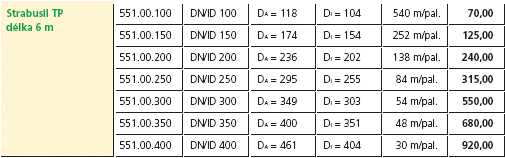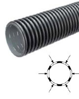 | Celoperforovaná drenážní trubka z PE-HD Dříve dodávána pod obchodním označením Strabusil SN 8 (TP) - V sendvičové konstrukci (vně vlnitá, uvnitř hladká) s volně přiloženou spojkou. - Vně černá, uvnitř šedá. - Mimořádně zatížitelná (SN 8 ČSN EN 9969). - Druhy štěrbin podle DIN 4262-1 a NF P 16351. |