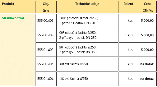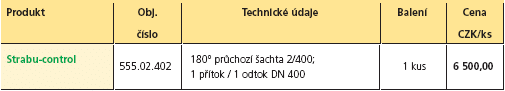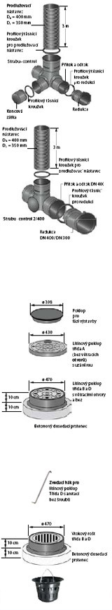 | Vnitřní průměr základního tělesa > 500 mm. Proplachovací a kontrolní šachta z PE -HD ; barva černá. Odolná proti UV záření; hmotnost cca 11 kg, mimořádně robustní. Odolná proti kyselinám, louhům, olejům, tukům a cementu dle DIN 8075, s integrovanou rezervou pro případné sedání nástavné trubky. Vodotěsná, podle DIN 4262-1. Lze zabudovat do dopravních ploch. Použití: Proplachovací a kontrolní šachta pro drenážní trubky Strabusil, pro veškeré stavby pozemních komunikací a inženýrských sítí. Možnost přímého připojení trubek Strabusil s těsnicím kroužkem. |