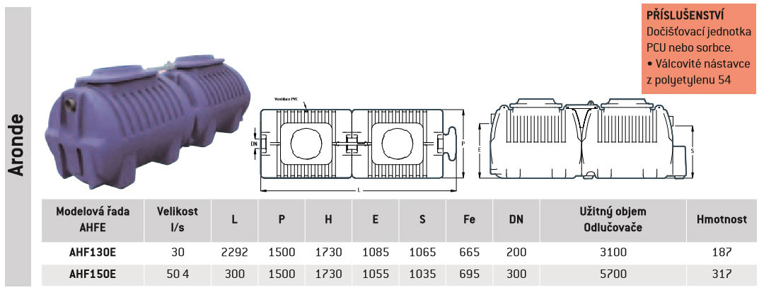Nátok a odtok z PVC. Příčka z polyetylenu s košem na filtr a vyjímatelným koalescenčním filtrem.