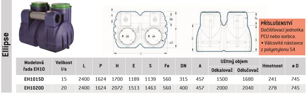Nádrž z recyklovatelného polyetylenu je vyrobena technikou rotačního odlévání a může být vybavena přechodovým dílcem (díly). Automatický vertikální uzávěr z polyetylenu kalibrovaný na 0,85. Nátoky a odtoky jsou opatřeny nitrilovým těsněním (kromě YH1001E) se vstupem a výstupem z PVC. Vstupní zařízení s ochranou proti přetečení a příčkou se sifónem pro obtok.