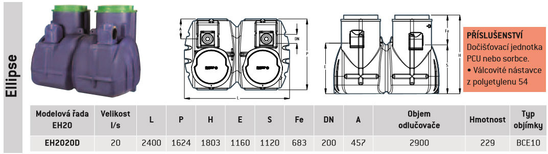 Nátoky a odtoky jsou opatřeny nitrilovým těsněním. Příčka z polyetylenu s košem na filtr a vyjímatelným koalescenčním filtrem.