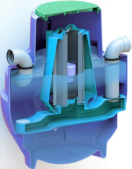 Nátok a odtok z PVC. Poklop z vyztuženého kompozitu. Kónická příčka – zcela vyjímatelný koalescenční filtr.
