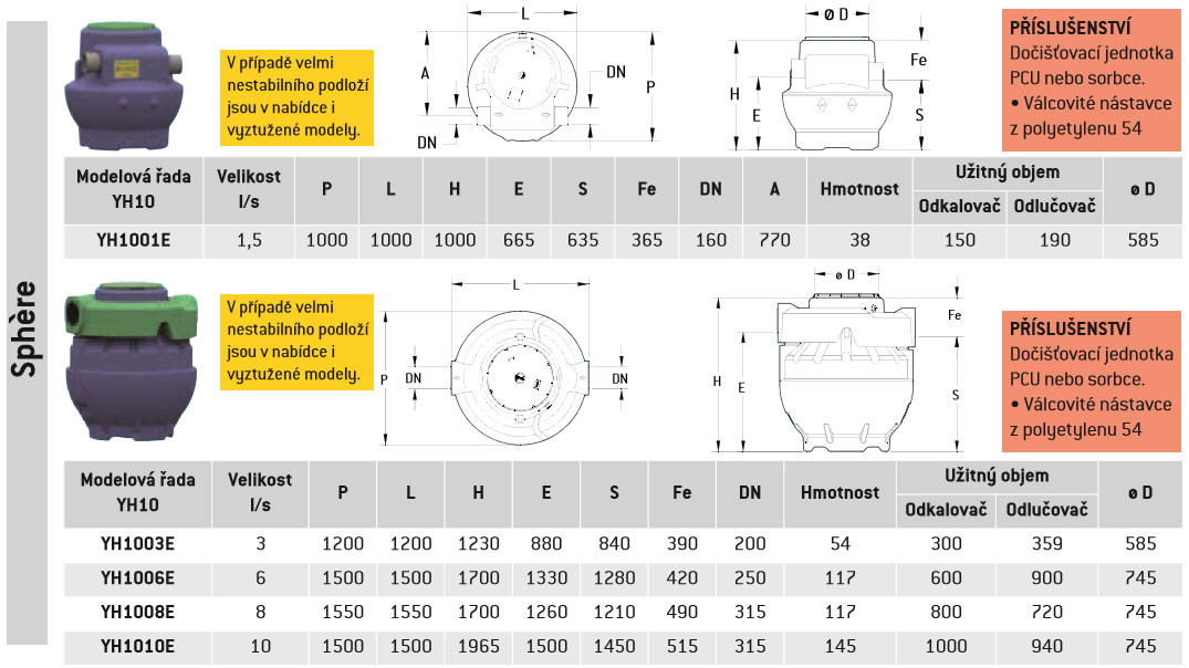 Nádrž z recyklovatelného polyetylenu je vyrobena technikou rotačního odlévání a může být vybavena přechodovým dílcem (díly). Automatický vertikální uzávěr z polyetylenu kalibrovaný na 0,85. Nátoky a odtoky jsou opatřeny nitrilovým těsněním (kromě YH1001E) se vstupem a výstupem z PVC. Vstupní zařízení s ochranou proti přetečení a příčkou se sifónem pro obtok.
