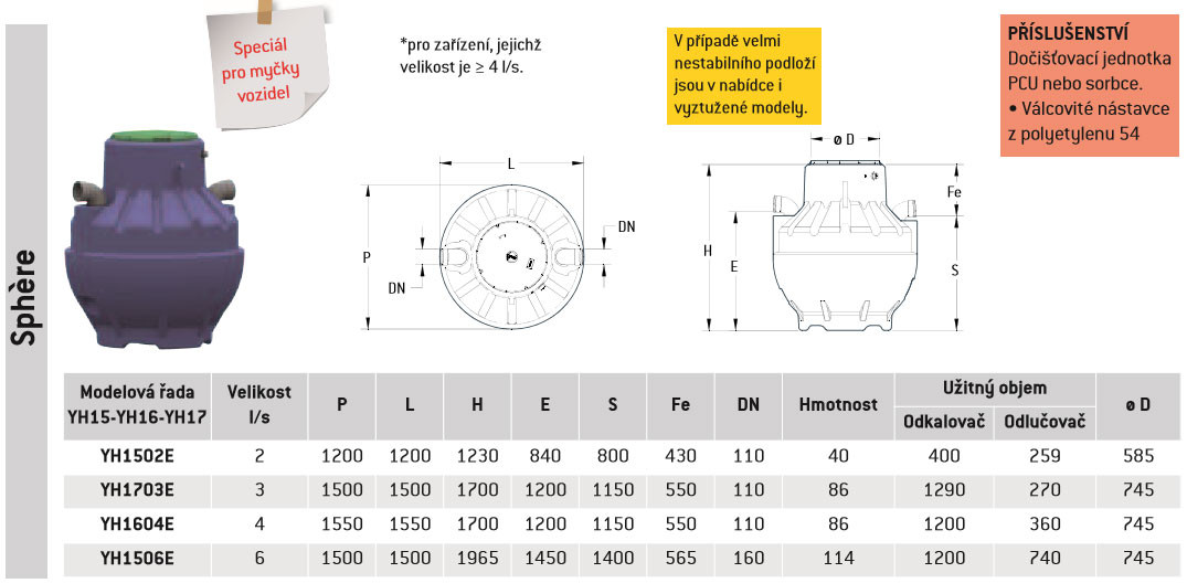 Nátok a odtok z PVC. Kryt z vyztuženého kompozitu. Kónická příčka – zcela vyjímatelný koalescenční filtr.