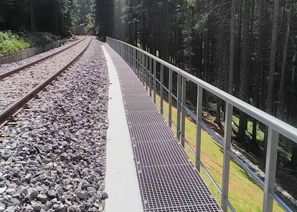 Při porovnání pracnosti v průběhu instalace a náročnosti na údržbu se pro zakrytí 130 metrů dlouhé lávky zvolilo řešení z mřížkových kompozitních roštů. Mřížkové rošty, díky své protiskluzové úpravě a vysoké odolnosti i v mrazech, jsou bezpečnější a bezúdržbové proti ocelovým roštům. Zábradlí na přemostění a na opěrných zdech je také z kompozitů. Jednoduchá montáž v těžko dostupném terénu přinesla vysokou cenovou úsporu.