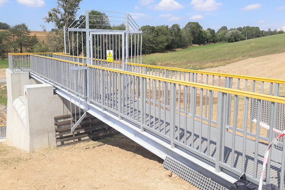 Stejně jako na suché nádrži v Jelení, která se realizovala na jaře, se nyní na lávku také použilo zábradlí z kompozitu. Pro konstrukční variantu bylo zvoleno zábradlí se svislou výplní s madlem ve žluté barvě.