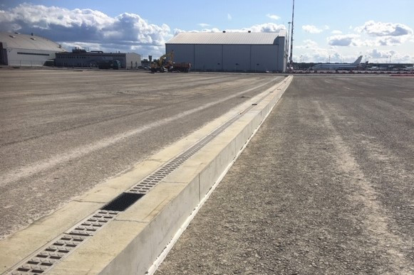 Na výstavbě 5-té ranveje na letišti v Rize se pro odvodnění použil hluboký monolický žlab MEA DM 2040 s potřebnou hydraulickou kapacitou. Žlab vyhovuje zatížení F900 kN a díky své konstrukci je vhodný pro odvodnění manipulačních i pojezdových ploch. Celková délka této etapy je cca. 500 metrů. Žlaby byly vyrobeny a dodány z našeho výrobního závodu v Plzni, kde je instalována moderní linka na výrobu polymerbetonových žlabů.