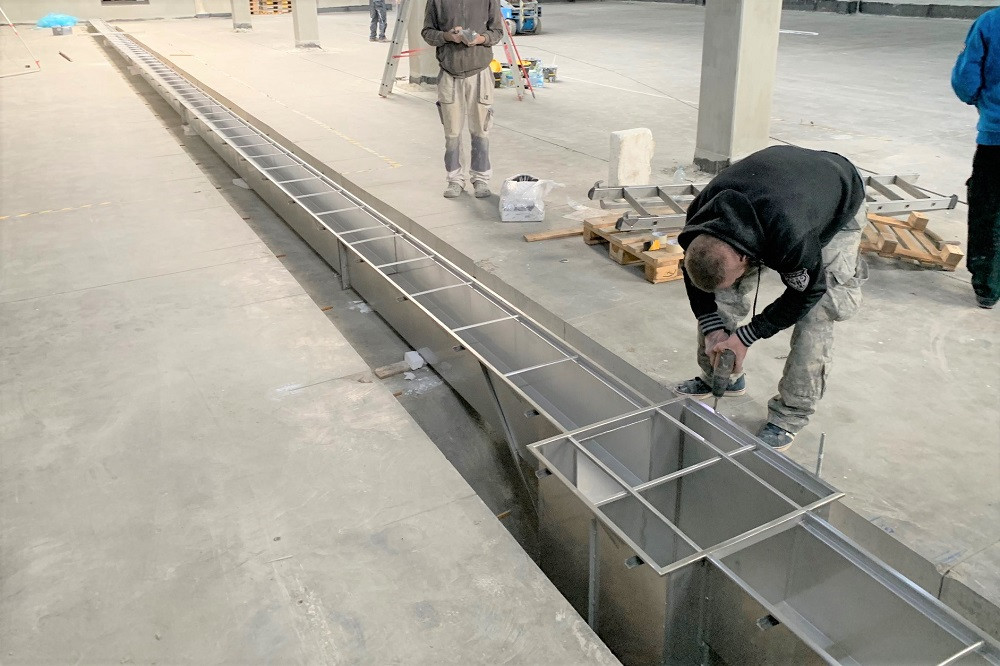 Nerezový žlab šířky 400 mm, určený pro odvodnění nyní instalované stáčecí linky minerálních vod v Kyšících, má dostatečně spádované dno a hrany vyztužené vysokopevnostním tmelem. Žlab musí odolávat i louhům a čistícím prostředkům, proto je vyrobený z oceli třídy 316. Po instalaci budou na žlaby položeny kompozitní rošty s protiskluzovou úpravou.