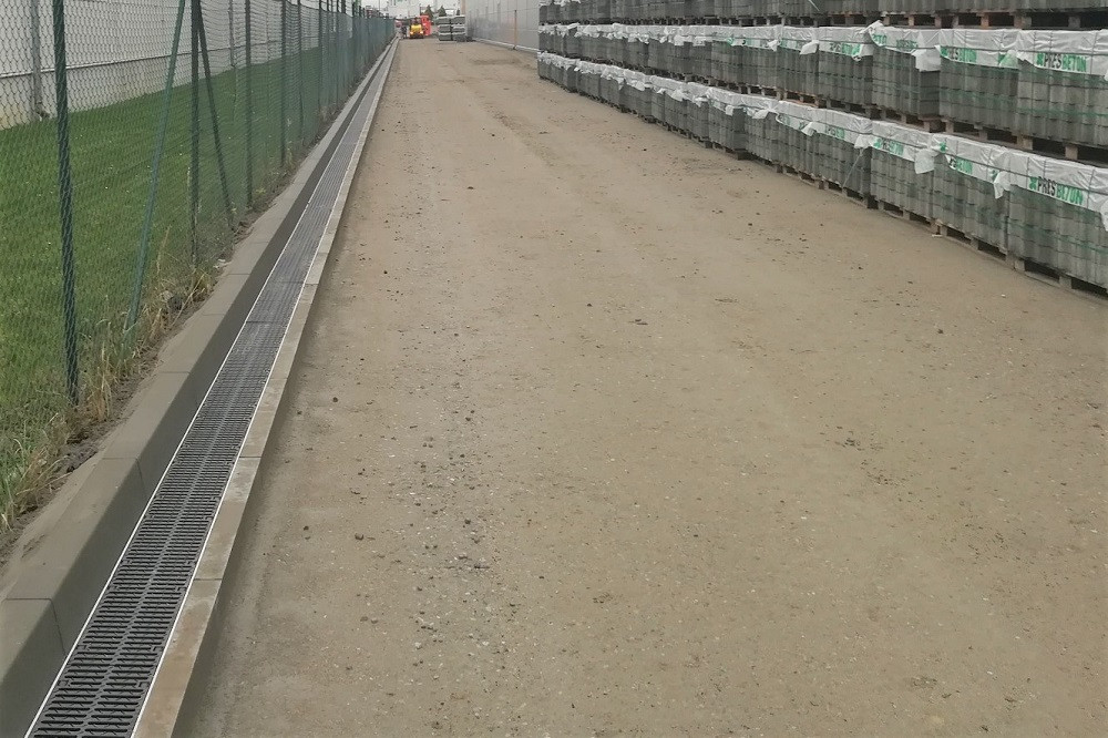 Odvodňovací žlaby MEARIN 200 usazené do betonového lože těsně před pokládkou dlažby. Odvodnění ve výrobním a skladovém areálu MB TOOL je řešeno liniovým odvodněním, které navrhli odborní projektanti MEA. Odvodňovací systémy optimalizují spády komunikace a jsou navrženy podle požadované zátěže a výpočtového množství dešťové vody. Návrh kombinuje systémy MEARIN PLUS 150 a 200 v celkové délce cca 300 metrů a monolitický systém DM2000 na příjezdové komunikaci.