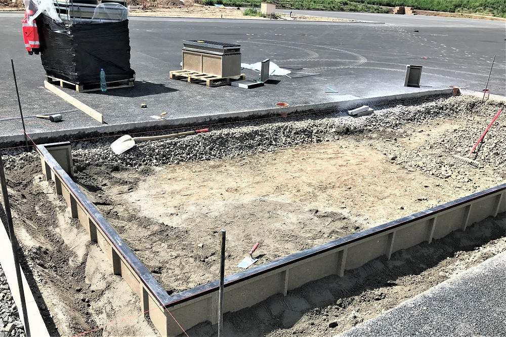 (Special KERBs for long jumps area with box channels made from polymer concrete with rubber top in Sportś area in Prague)