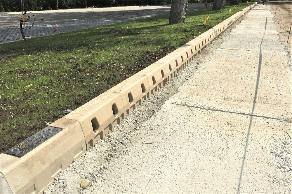 Realizace odvodnění ulic v době koronaviru se posunula, ale v letních měsících již instalace žlabů úspěšně  probíhá. Ulice jsou odvodněny obrubníkovým odvodněním MEA KERB a příčné odvodnění přes křižovatku monolitickým odvodněním MEA DM2000. MEA Kerb nezasahuje do vozovky a voda může plynule odtékat i při nulovém podélném spádu. Některé plochy byly navíc odvodněny žlaby MEARIN 200 s můstkovým litinovým roštem. Fotografie ukazuje žlaby MEA KERB před aplikací finální povrchové vrstvy vozovky.