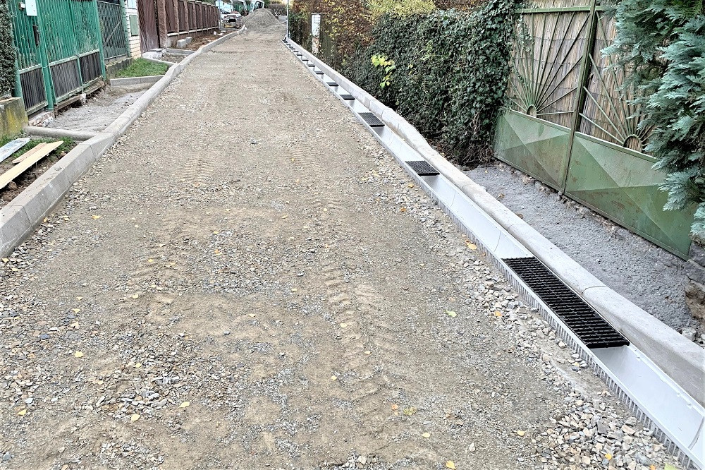 (Linear drainage system MEARIN PLUS 200 used during reconstruction of street in Jiloviste Near Prague. The only one line of channels in lenght 230 meters with 1 gully in the end were hydro calculated without any other outlet, which saved cost for sewerage underground system.)