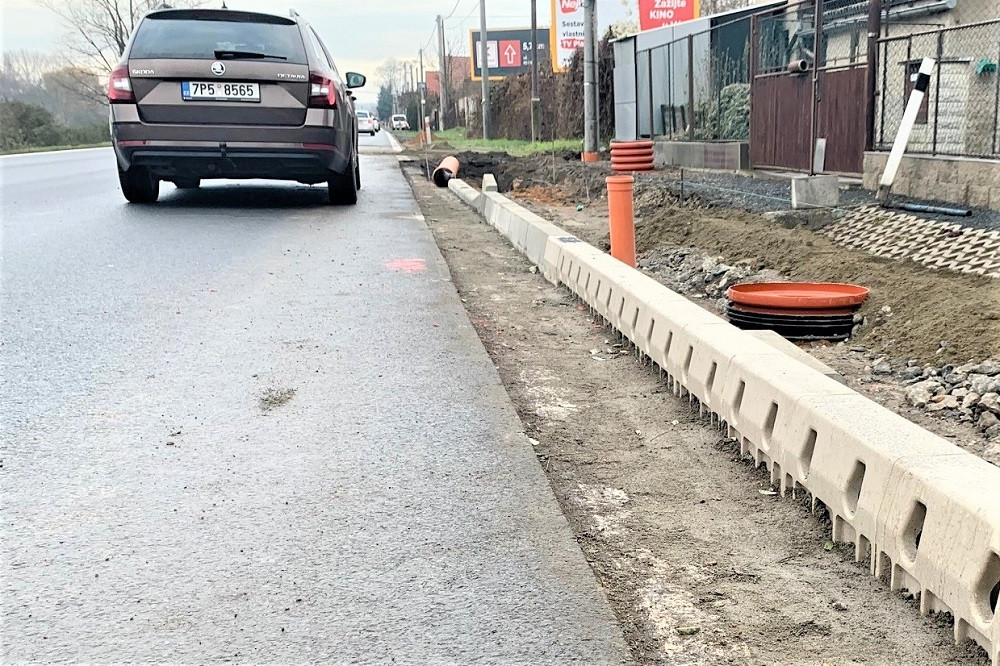 (Main street with 0% slope in town Kly on the road No. 9 Melnik-Praha are installed with MEA KERB linear drainage system from polymer cocrete in total lenght 180 meters. Delivery including five retension tanks for rain water.)