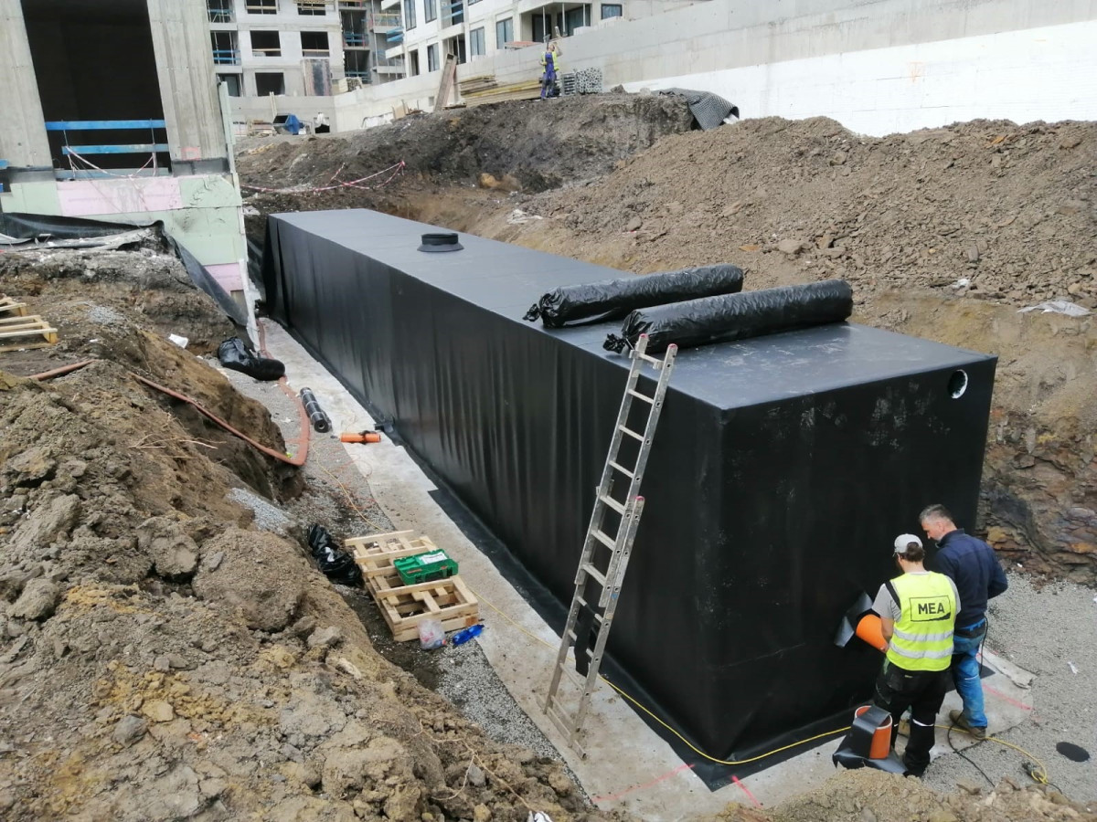 Pro zachycení přívalových dešťů jsou v obytném souboru  instalovány vhodně navržené retenční nádrže v celkovém objemu cca 120 m3. Vzhledem ke stíženým prostorovým podmínkám je tvar nádrží, seskládaných z pevných bloků, rozměrově přizpůsobený okolním objektům.