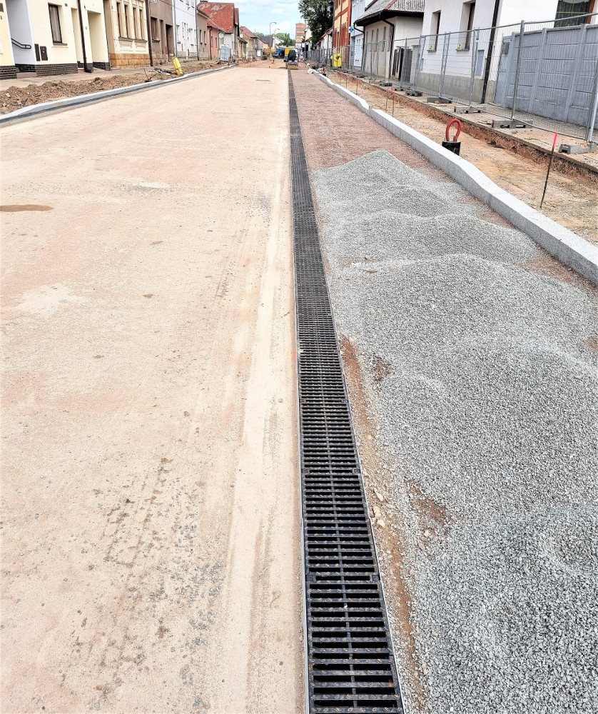 (Street with 0%  slope is successfully solved by linear drainage system MEA SV2000 in total length 600 meters approx. in Novy Bydzov, CZ.)