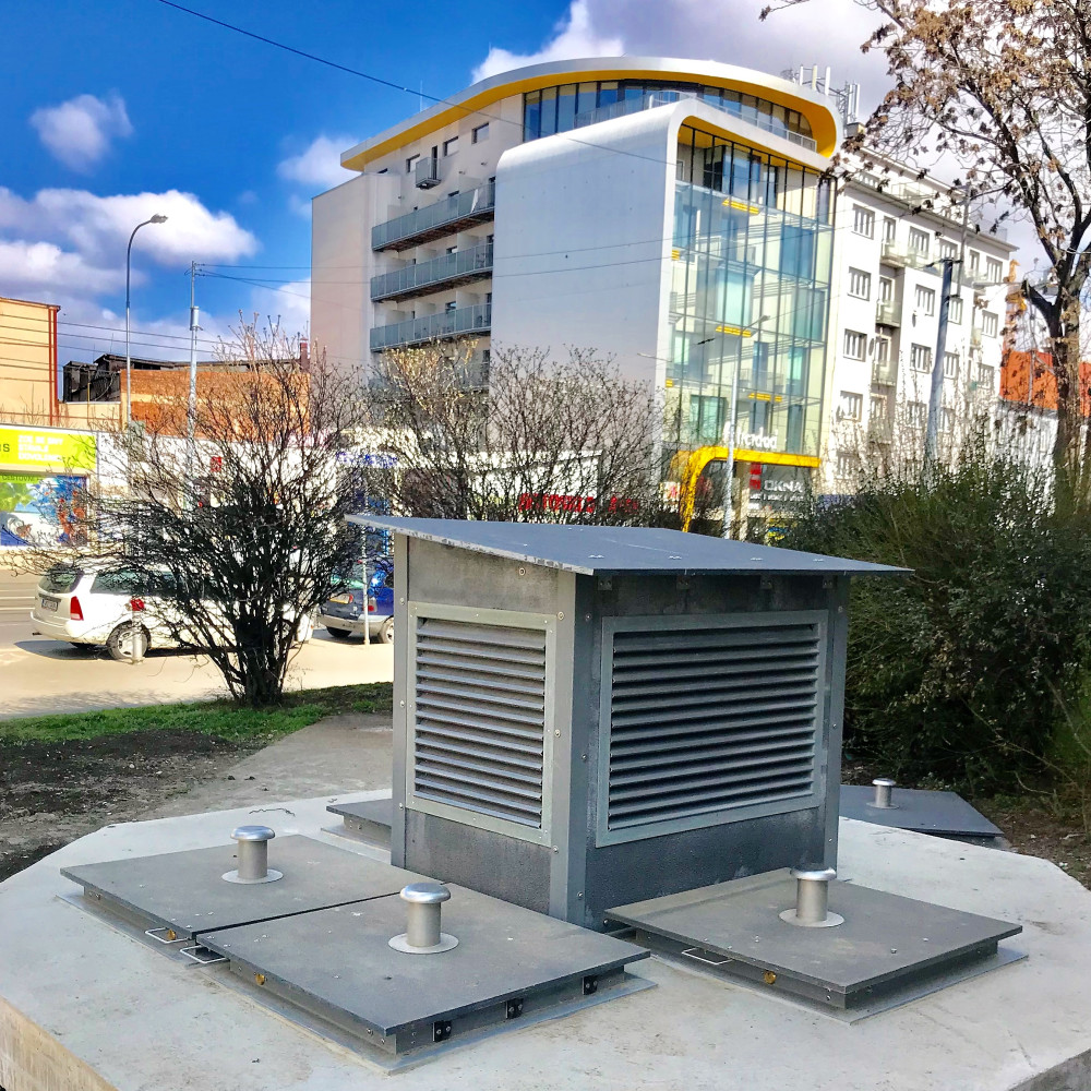 Kompozitní materiály nejsou používané pouze uvnitř kolektorů na kabelové lávky, žebříky nebo rošty, ale v tomto případě byly použity na vybavení větracího objektu. Na kompletní vystrojení kolektoru jsme navázali stavbou kompozitní větrací šachty a vstupních poklopů. Poklopy jsou uzamykatelné a vodotěsné s nerezovým větracím komínkem. Větrací šachta je kompletně z kompozitních profilů a desek, výborně tak odolává povětrnostním vlivům a zevnitř zvýšené vlhkosti.