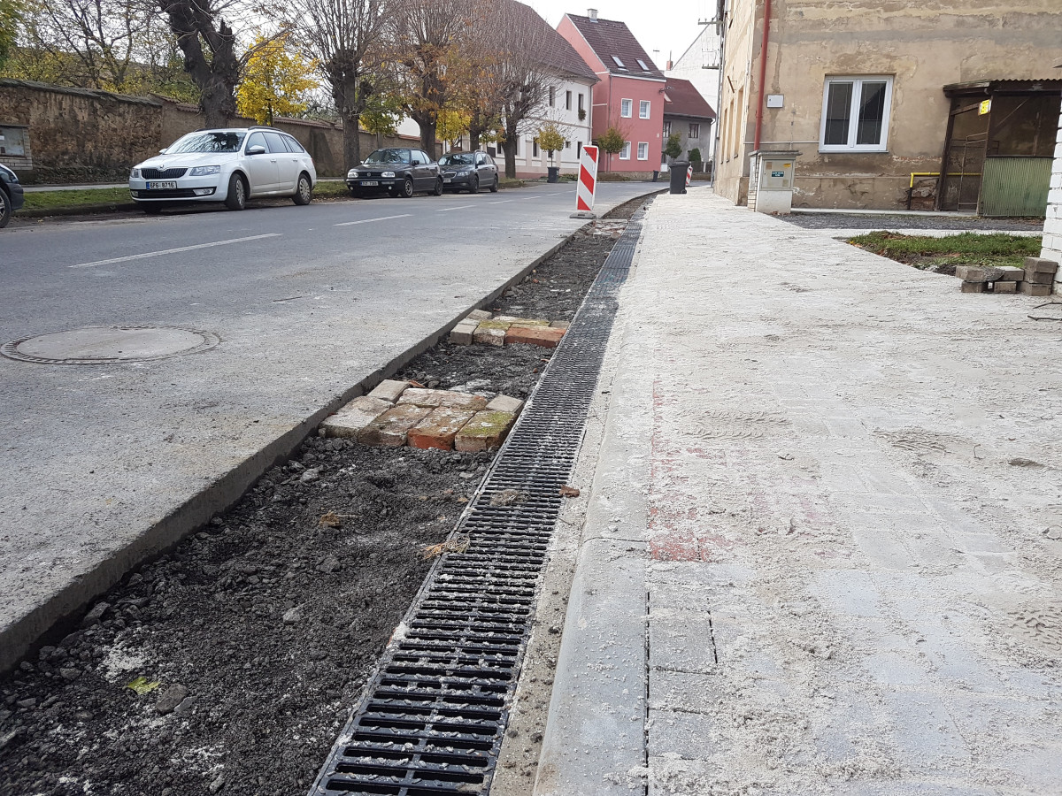 Pro rekonstrukci dešťové kanalizace a odvodnění ulice byl z důvodů úspor a malých spádů provedeno odvodnění systémem MEA EN2000 s podélným spádem. Povrchové odvodňovací žlaby nahradily kanalizační vpusti, přípojky a hluboké výkopové práce. MEA EN2000 je žlab s litinovou hranou pro zatížení až F900 kN, v tomto případě byly instalovány litinové rošty D400 kN.