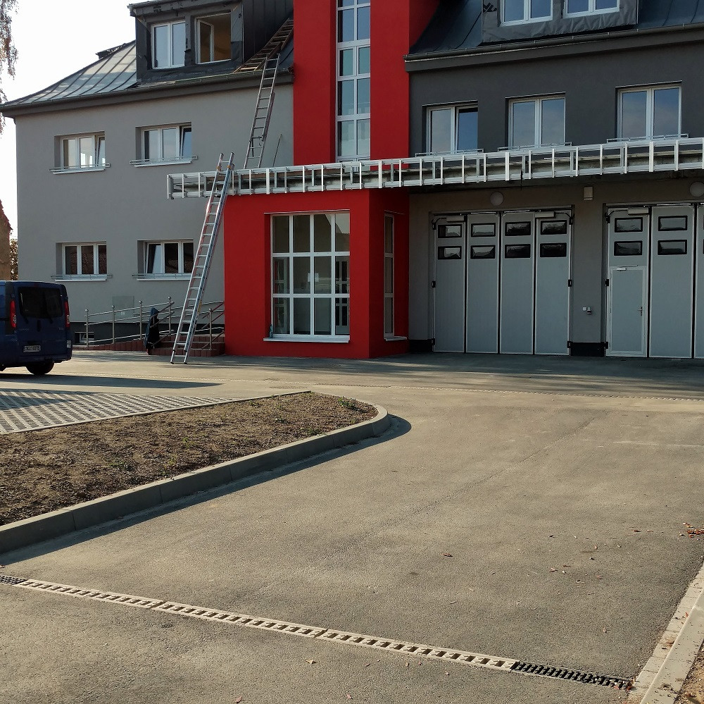 Plochy u nově otevřené hasičské zbojnice v Chrástu jsou odvodněny monolitickým odvodńovacím systémem MEADRAIN DM ve světlých šířkách 100 a 200 mm. Monolitické žlaby jsou určeny pro těžký a rychlý pojezd a jsou bez pohyblivých částí. Používají se na frekventované komunikace i zátěžové areály s požadavkem na zatížení až F900 kN.