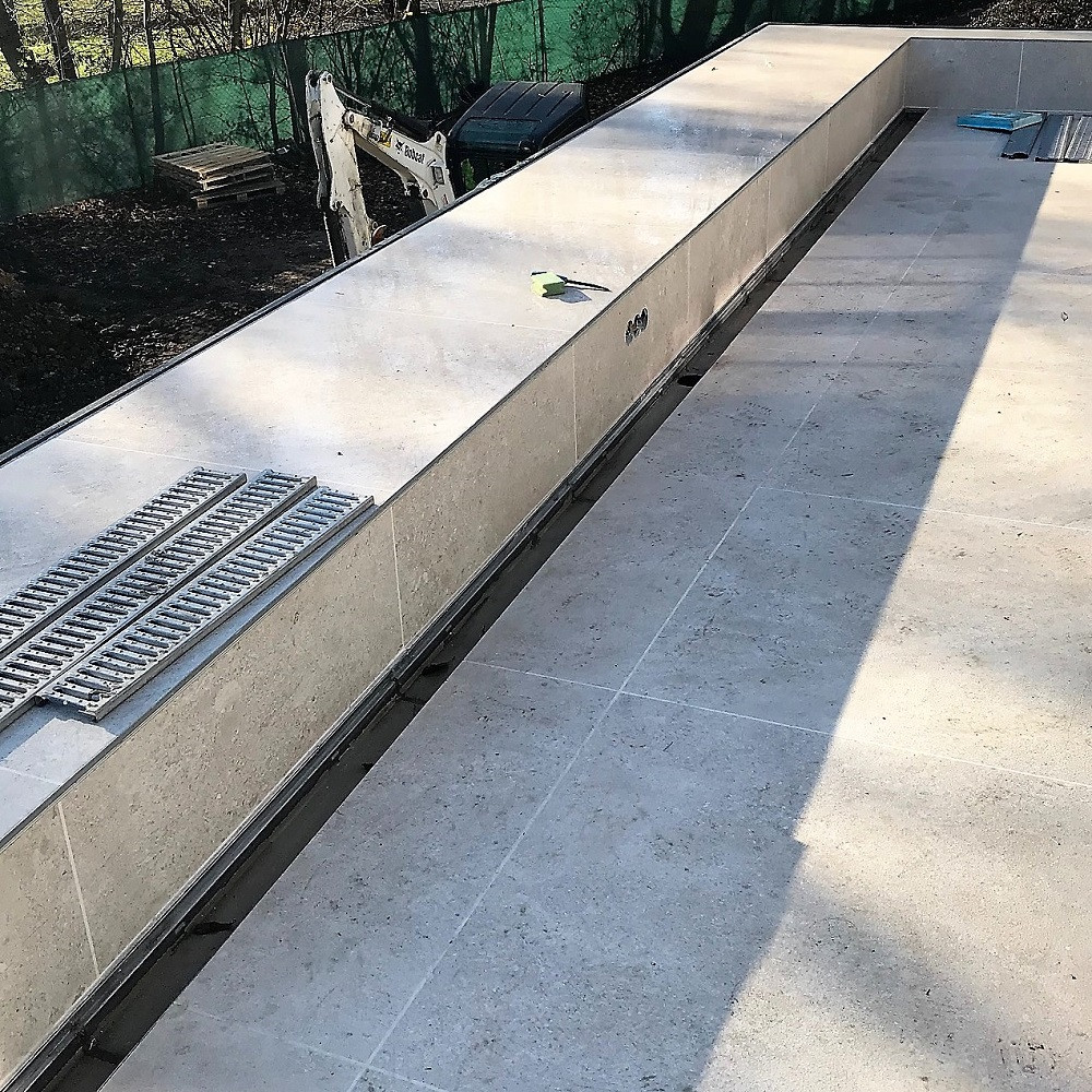Žlaby EF 1000 s nerezovou ochrannou hranou a nerezovým můstkovým roštem A15 kN jsou použité na terase vily v Šáreckém údolí. Výškově limitované kontrukci se muselo přizpůsobit i odvodnění, proto zde byly použity žlaby se sníženou stavební výškou. Voda je tak spádována jedním směrem a svedena do podélného žlabu. Snížené žlaby se vyrábí v několika provedeních SVF, VF, ENF a v různým šířkách 100, 150 až 200 mm a používají se také pro odvodnění podzemních parkovišť, ramp  nebo vjezdů do garáží.
