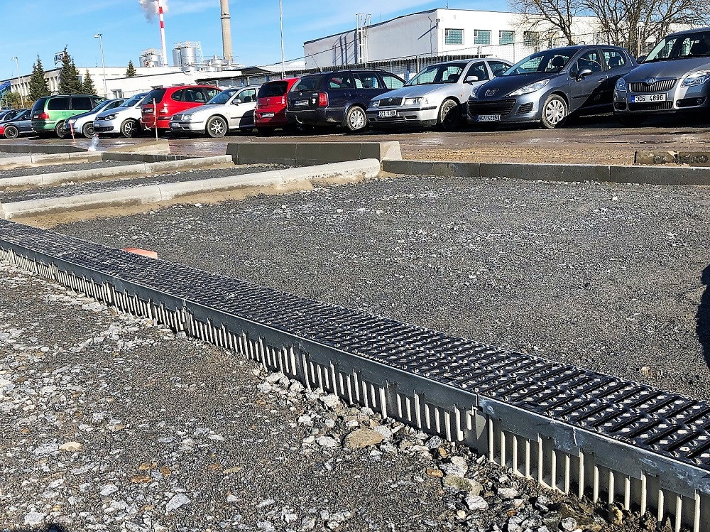 Parkoviště v Plané před areálem Madeta odvodňují žlaby MEARIN Expert 200