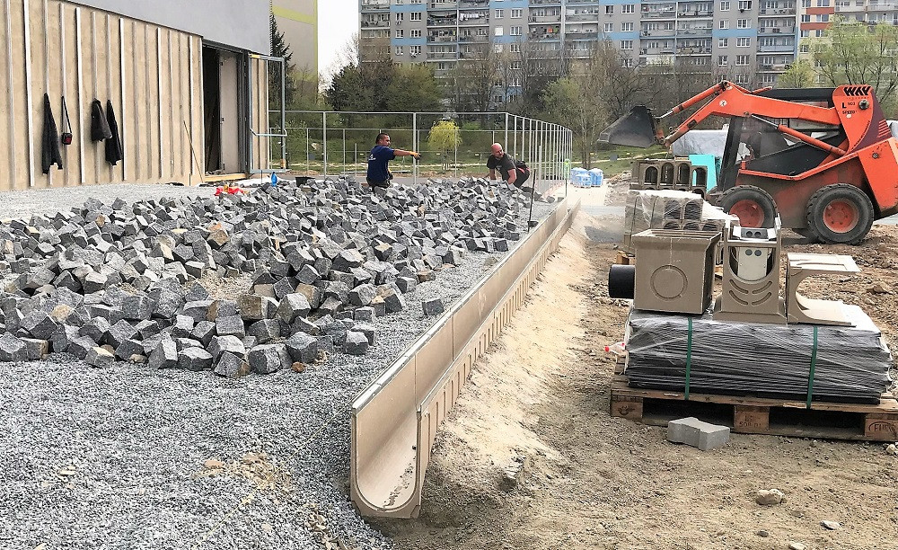 Odvodnění zpevněných ploch u sportovního centra Na Chobotě v Praze se realizuje žlaby MEA SV2000