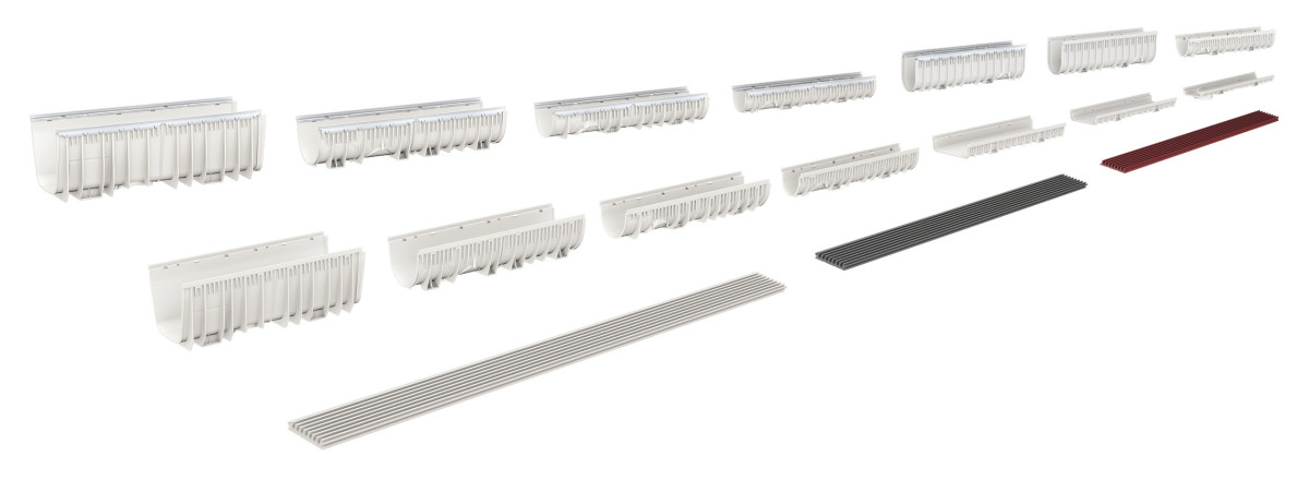 Žlaby 100-150-200 mm z SMC kompozitu se sníženou stavební výškou 55-100 mm.