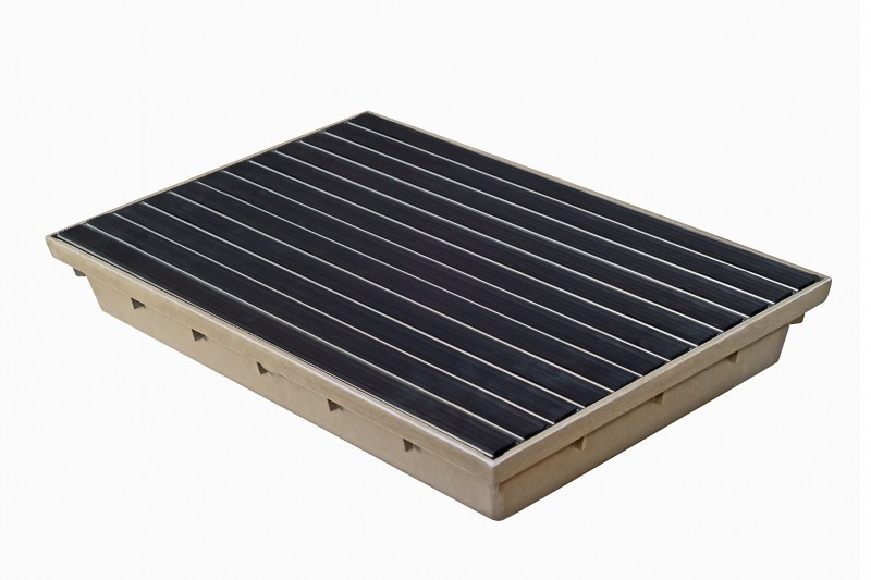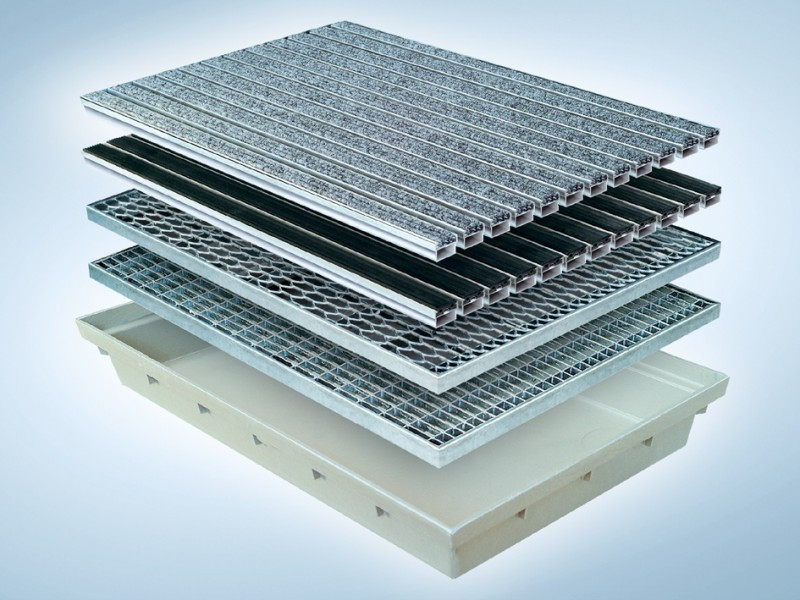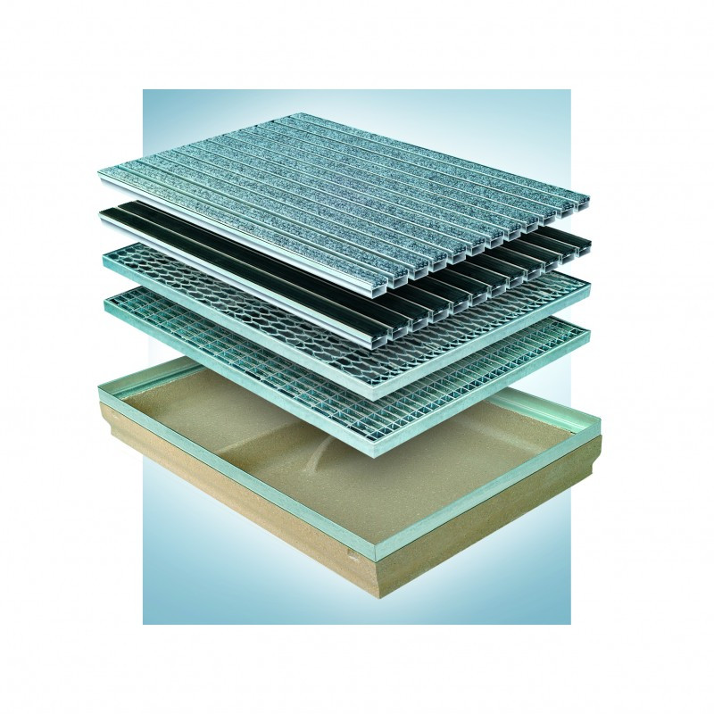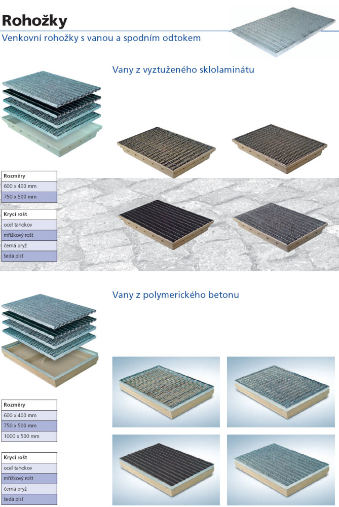 Vstupní venkovní rohožky s roštem a vanou. Vana z polymerického betonu má odtok do dna. Volitelné typy roštů. Rohožka s ocelovým roštem nebo pryží.