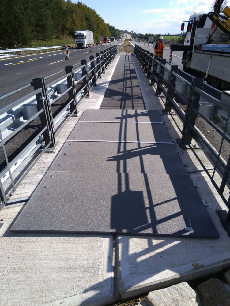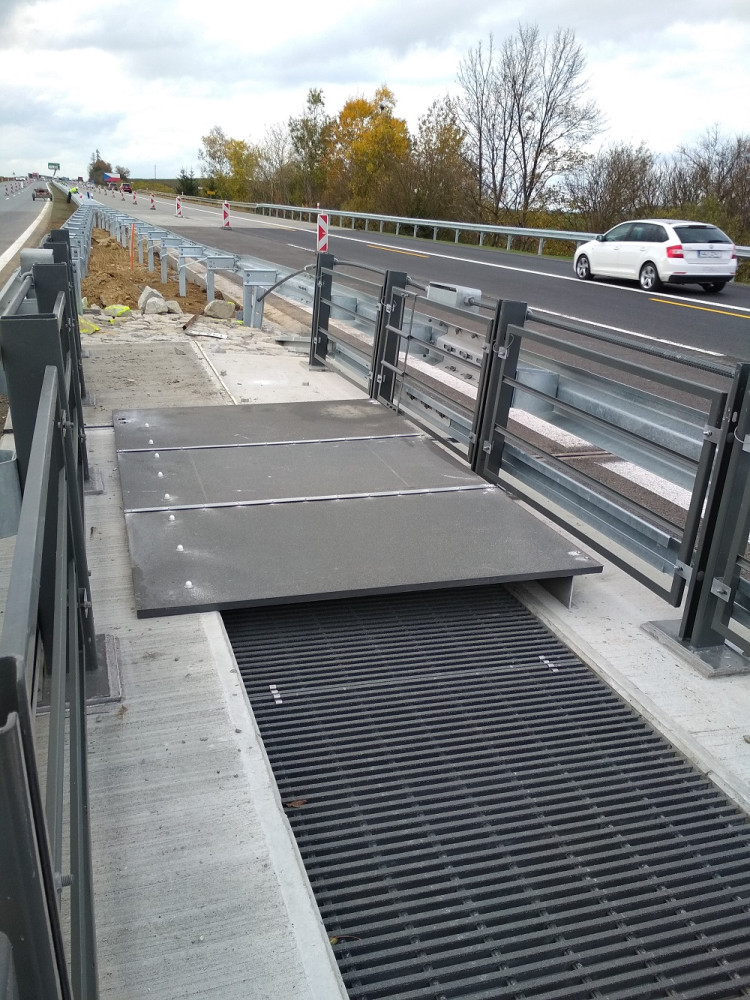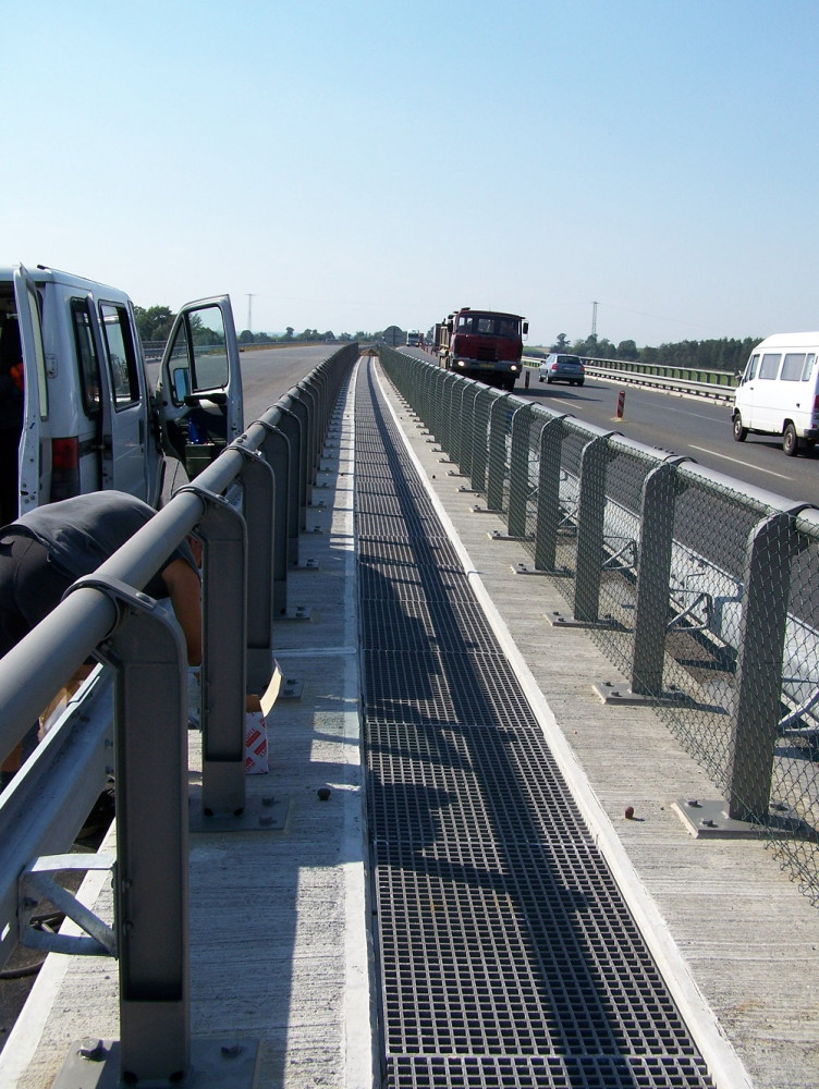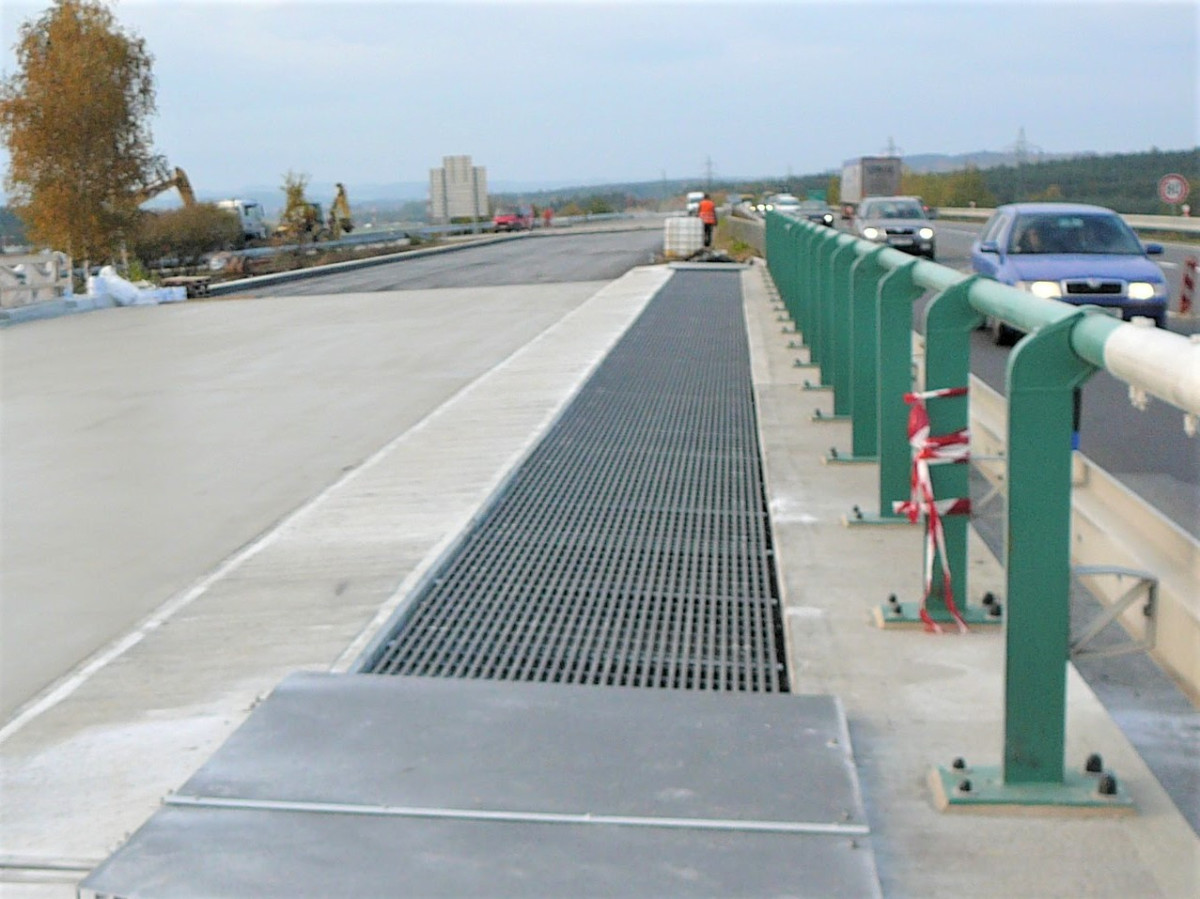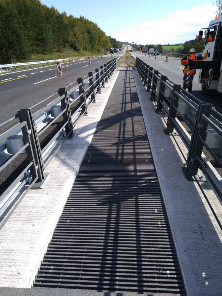 Montované rošty z tažených profilů na zakrytí volného prostoru mezi dvěma mostovkami na dálničních mostech.